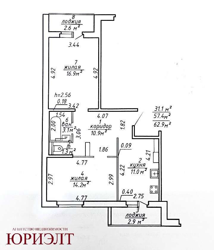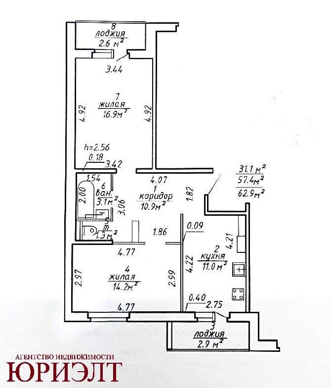 Общая площадь 62.9 м