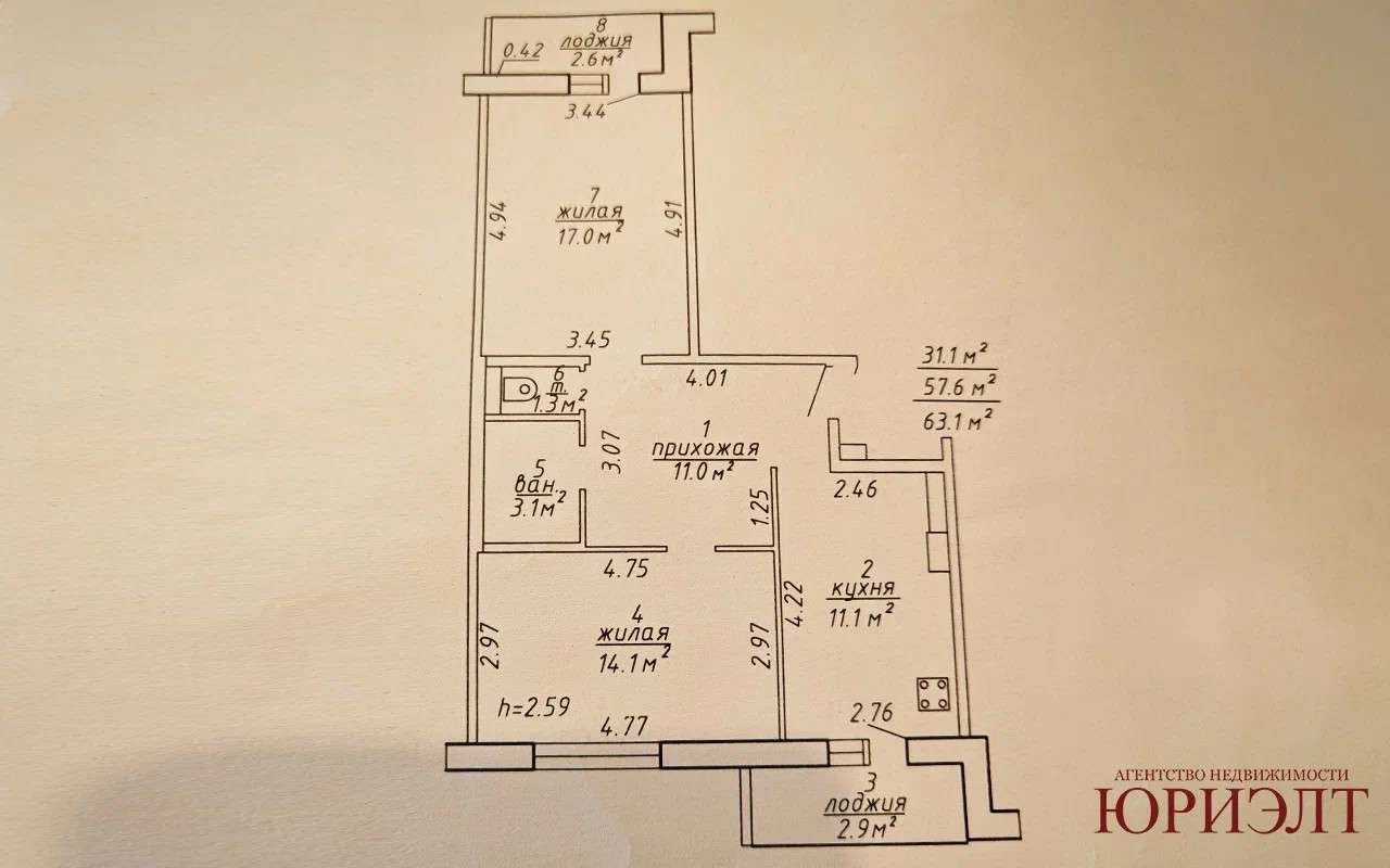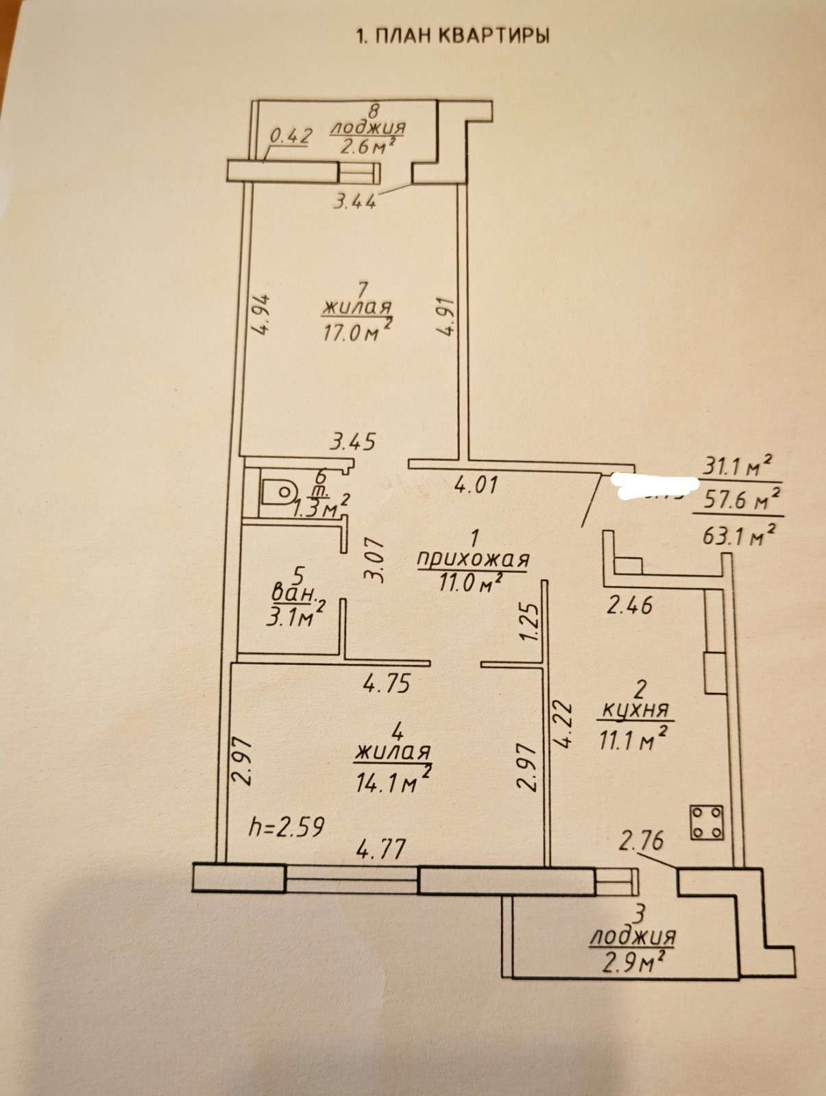 Общей площадью 63.1м2, жилая 31.1м2, большая кухня 11.1м2 мечта любой хозяйки.