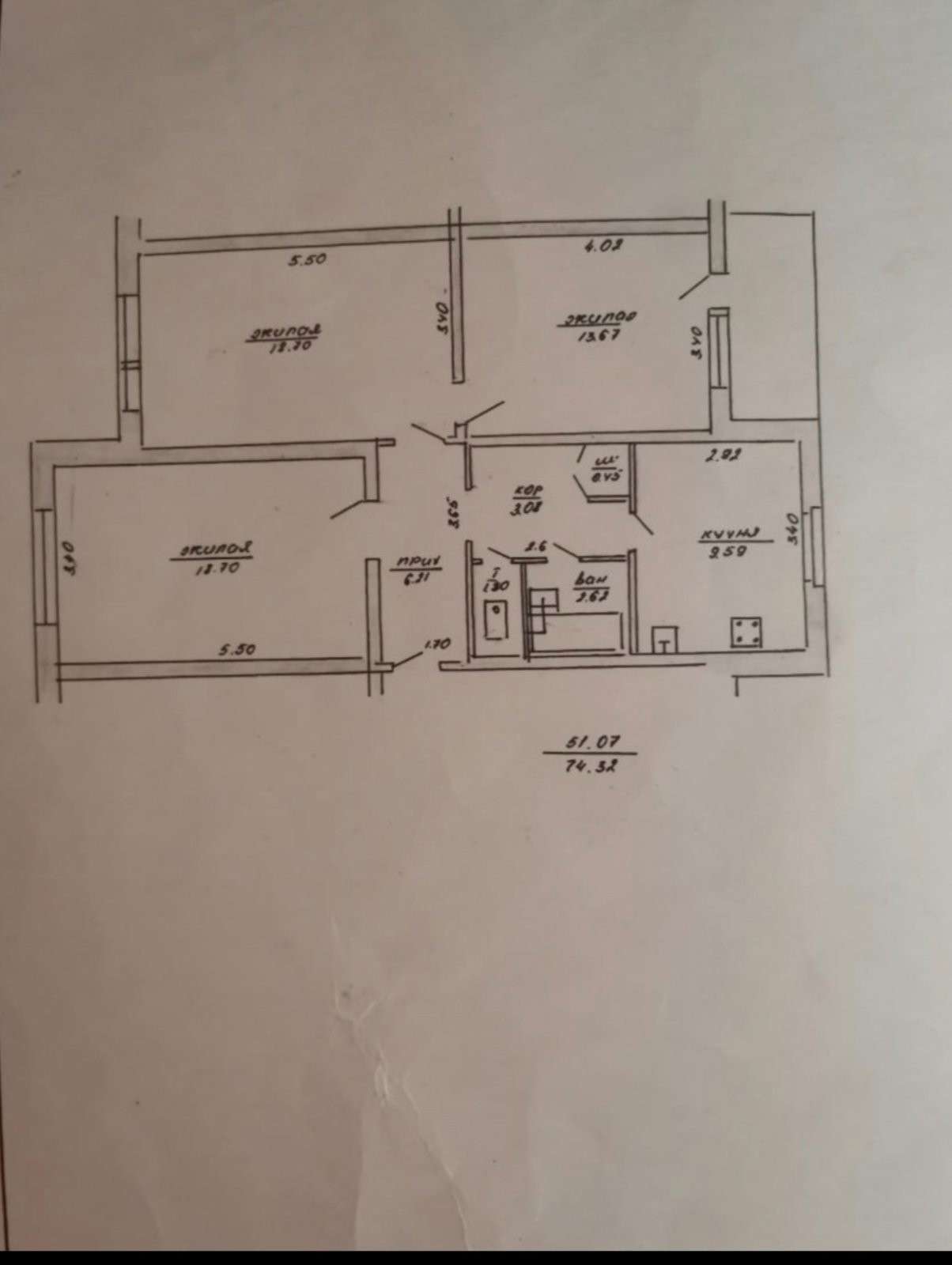 Общей площадью 74.32м2, жилая 51.07м2, кухня просторная 9.59м2.