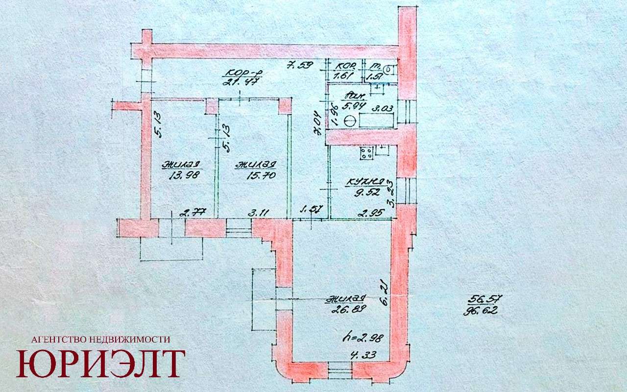 Жилая площадь 56.57 м