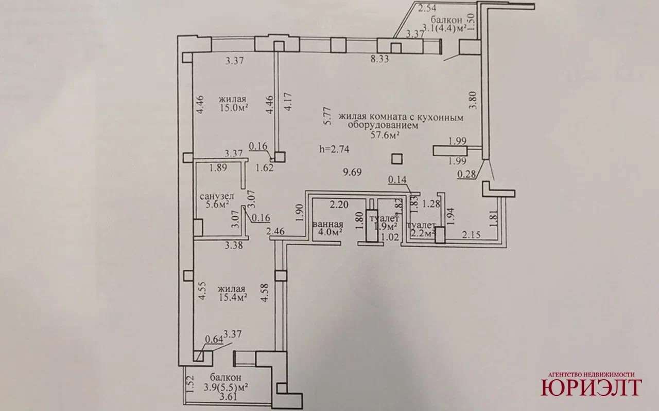 - две изолированные комнаты — 15 кв.м. и 15,4 кв.м.;