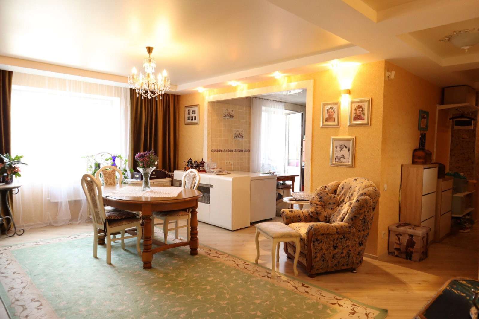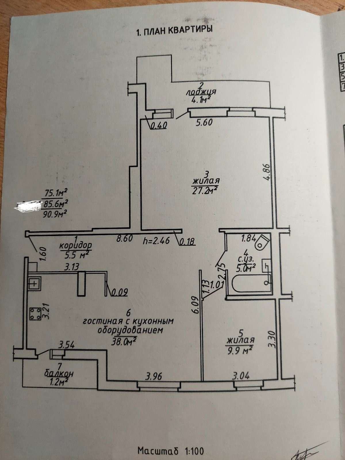 Общая площадь квартиры 85.6 М2, жилая площадь 75.1 М2, кухня совмещена с гостиной, совмещённый санузел.