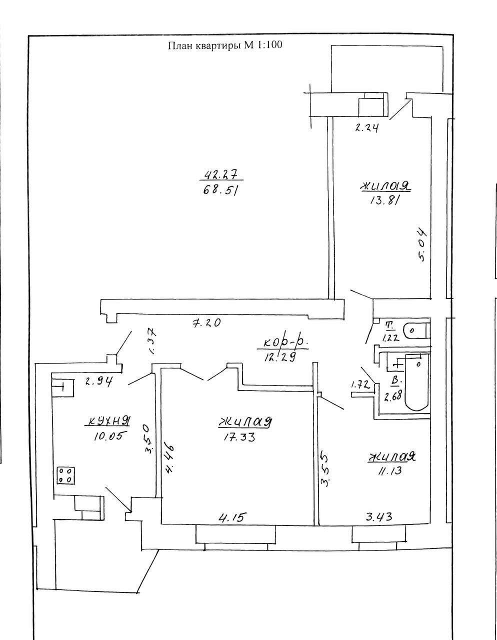 Общая площадь квартиры 68,51 м², жилая 42,27 м², кухня 10,05 м².