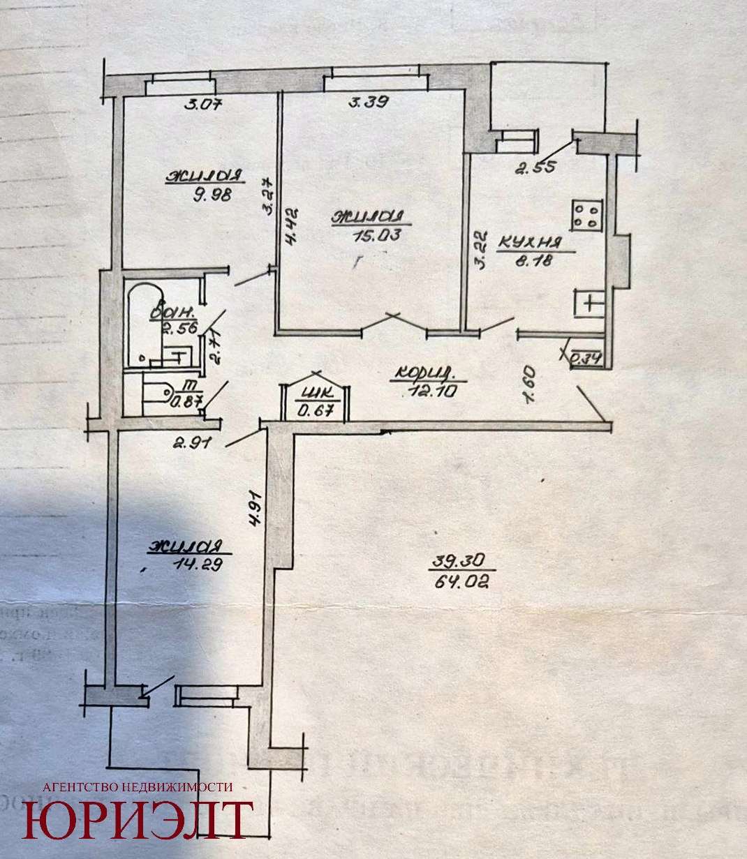 • Площадь: Общая 64 кв.м. (жилая 39,3 кв.м., кухня 8,18 кв.м.).