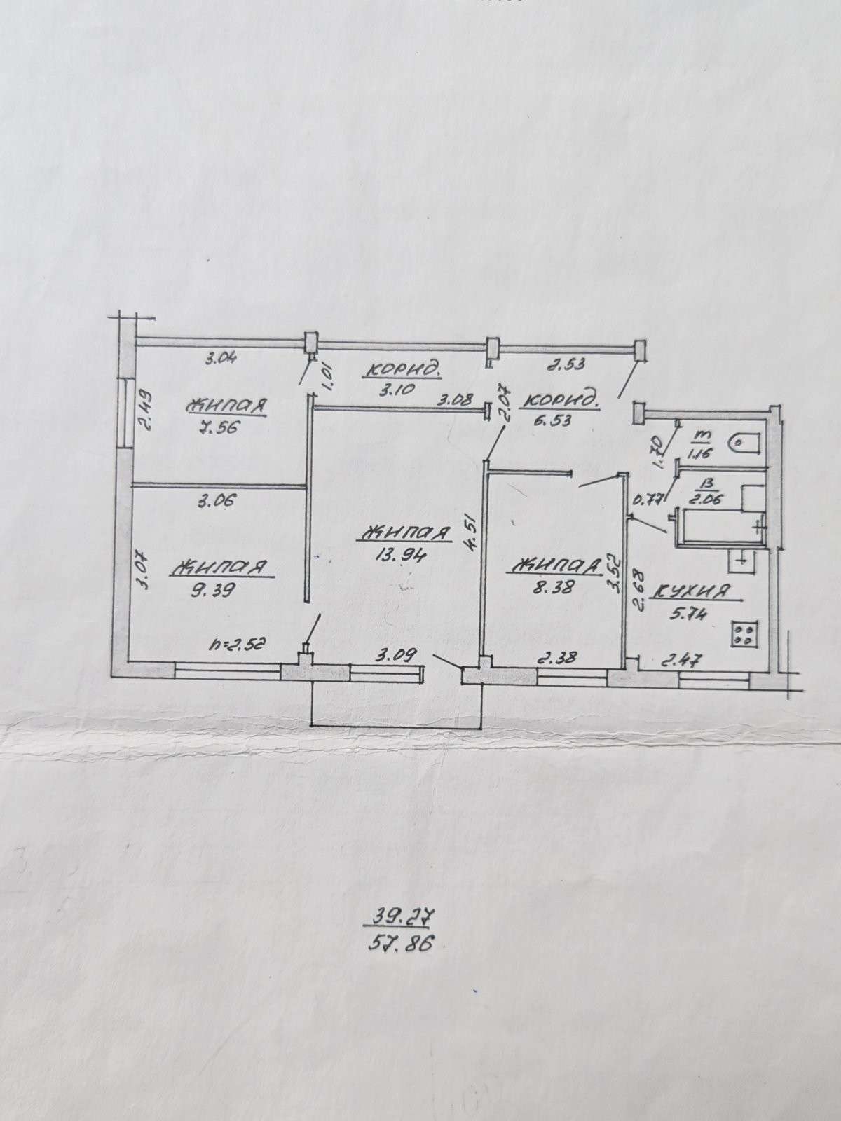 Общей площадью 57.86м2, 39.27м2, кухня 5.74м2.