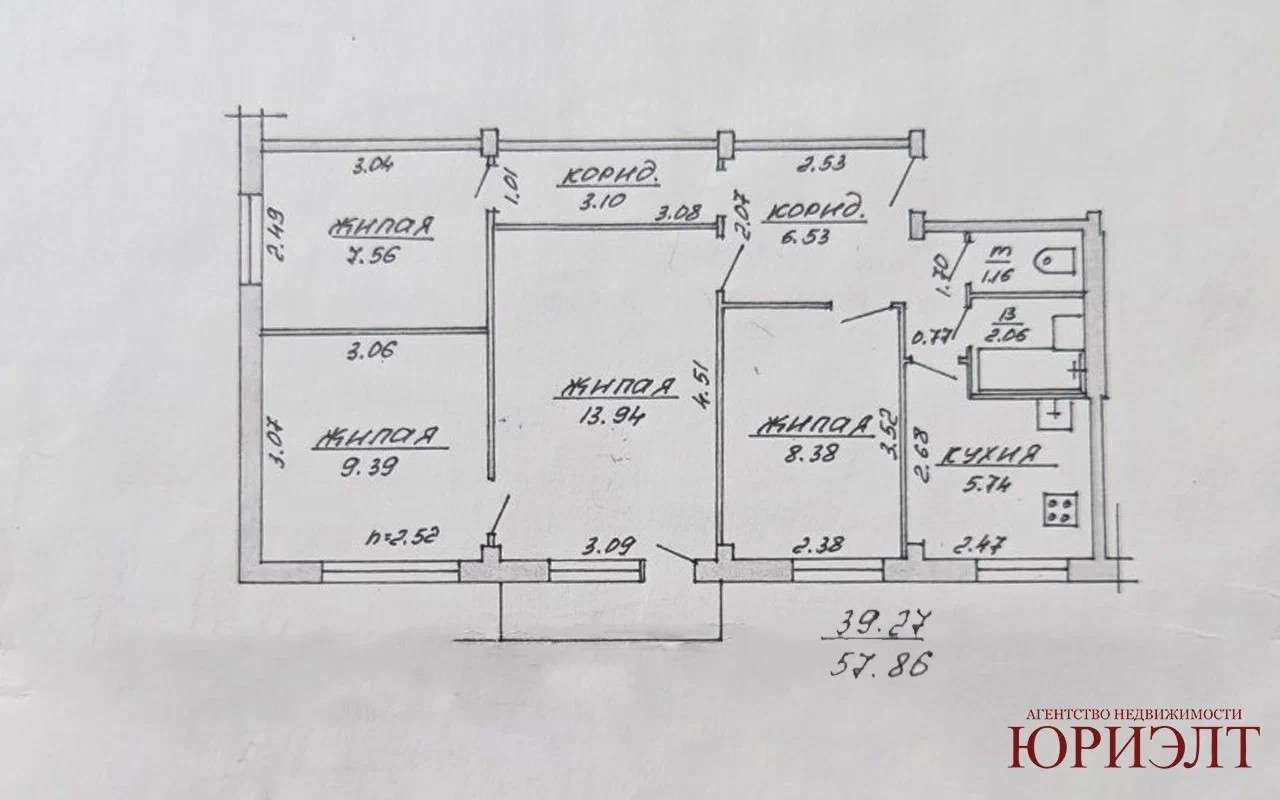 Общей площадью 57.86м2, 39.27м2, кухня 5.74м2.