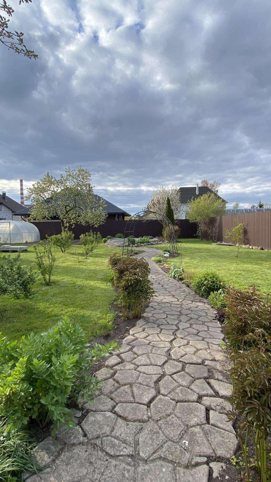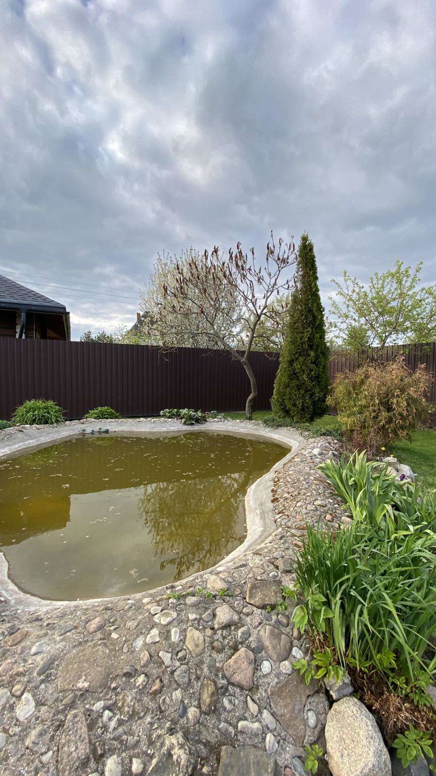 На участке газон с прудом.